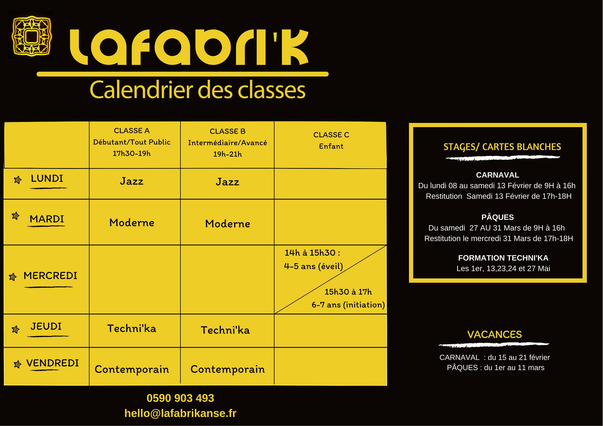 Abymes ChauvelLes classes proposées à partir du 11 Janvier : - Classe enfant (4-5 et 6-8 ans) Classes de danse en : Techni’ka, Jazz, Moderne, Contemporain - Atelier scénique - Formation […]