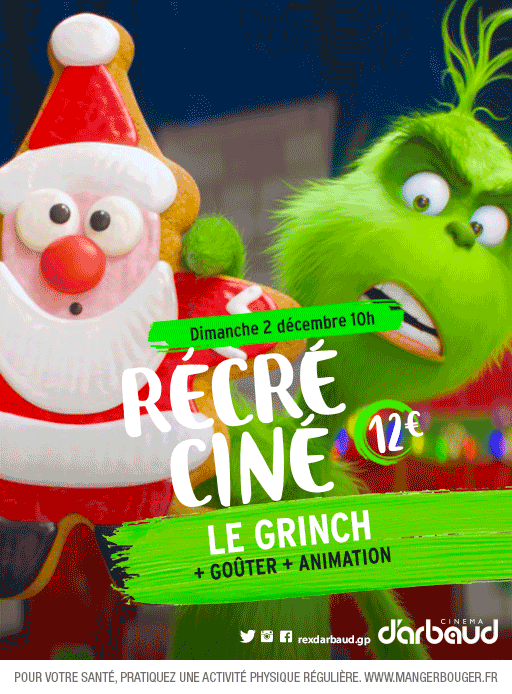 Le GRINCH veut nous voler Noël, allez-vous le laisser faire ? Dimanche 2 décembre à 10h00, c’est le RECRE-CINE avec ton film d'animation LE GRINCH, Ton GOUTER et une ANIMATION de Châteaux Gonflables et Barbe à Papa 12 € Dimanche 2 décembre à 10h, rejoins nous au RECRE-CINE du Cinéma D'ARBAUD ! Achetez vos places […]