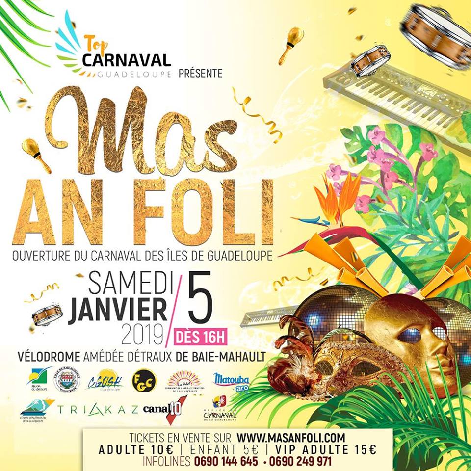 Samedi 5 Janvier 2019, nous vous invitons à vivre la 2ème édition du MAS AN FOLI : l'ouverture du carnaval des îles de Guadeloupe. Dès 16H, c'est au Vélodrome Amédée DÉTRAUX de Baie-Mahault que 30 groupes carnavalesques vous offriront un spectacle majestueux. Gwoup a Po, Groupe à Caisses claires, Groupe à Ti mas,Groupe à Synthé, […]