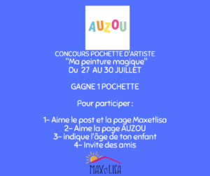 Vous voulez découvrir les pochettes? Auzou offre un concours jusqu’au 30 juillet qui se déroule sur la page facebook 2 jolies pochettes à gagner https://www.facebook.com/maxetlisaofficiel/