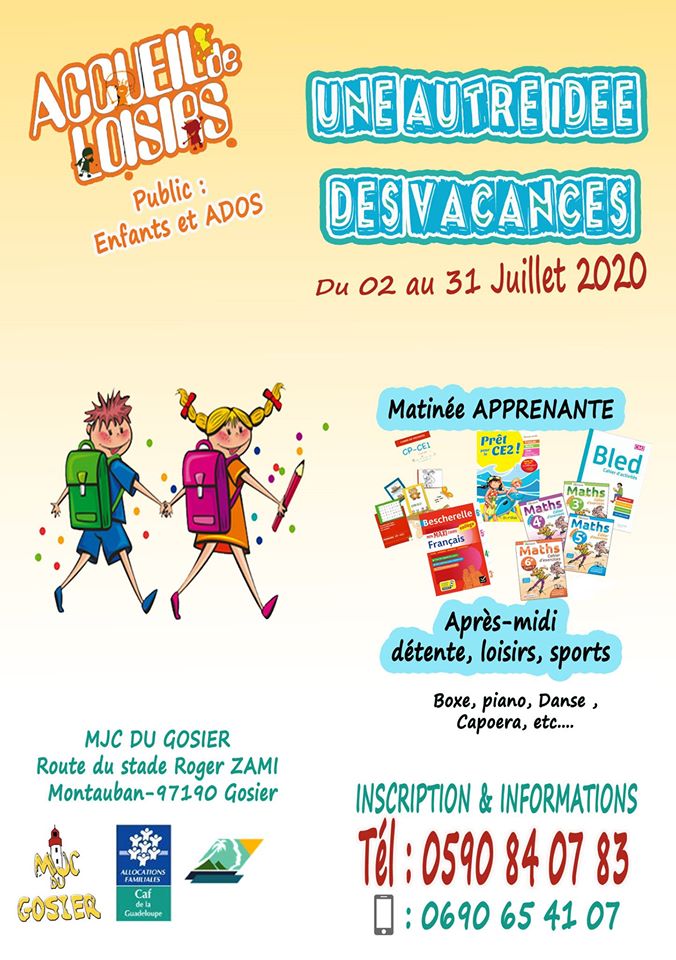 Du lundi 13 au samedi 18 Juillet 2020 de 9h à 16h30 Possibilité d’accueil dès 8h00 Lieu : Sainte-Rose, rue de la Plage des Amandiers. *Navette...